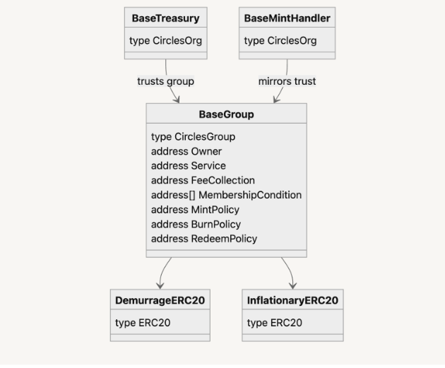 There are also the following “auxiliary” contracts deployed for every group, which are both registered as organisations on Circles.