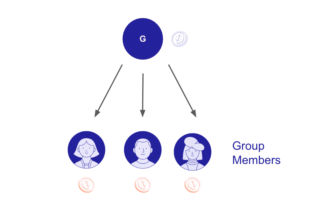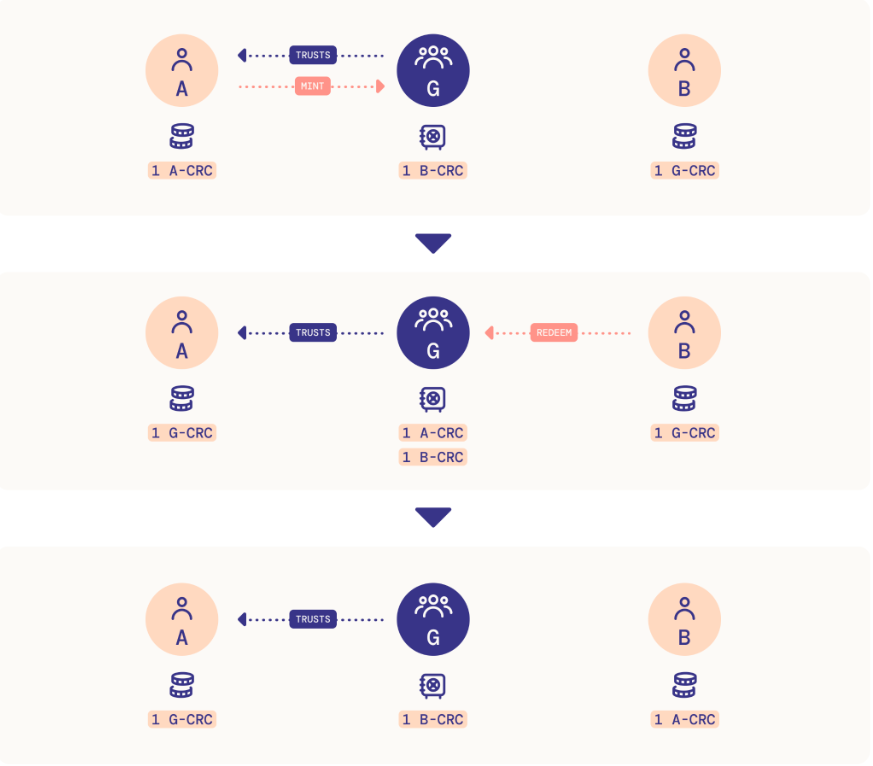 Minting: If account A is a member of group G, then any account that holds A-CRC can turn them into G-CRC, at a rate 1:1.